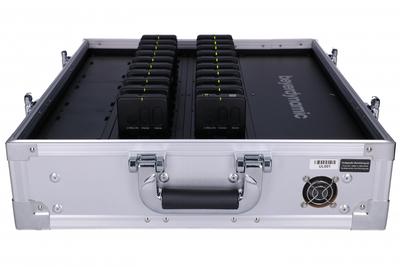 El maletín de carga con fuente de alimentación integrada y conexión de alimentación IEC para el sistema de guía personal Beyerdynamic no sólo protege los distintos componentes durante el transporte, sino que también permite cargar los dispositivos en él.